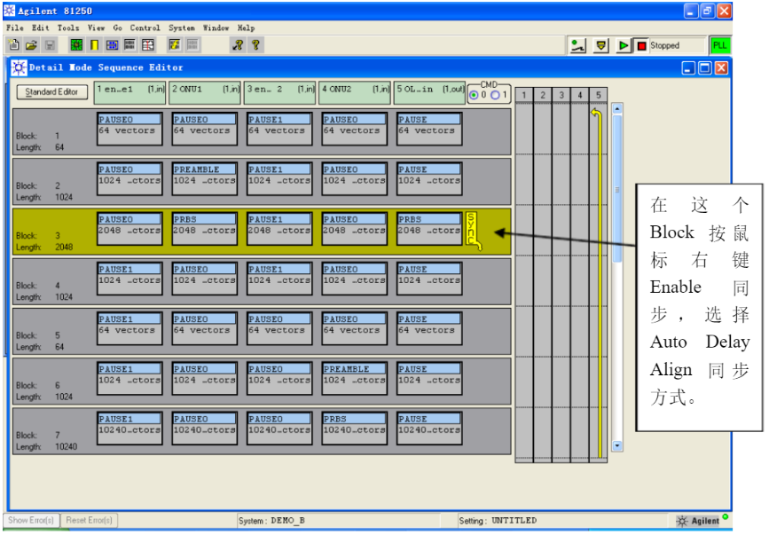 下面我們要根據(jù)GEPON測試的要求,設(shè)置每個序列的碼型,enable信號是“0”和“1”,用于開啟和關(guān)斷激光器,ONU 需要發(fā)送Burst信號,由preamble和PRBS 組成。由于有兩路ONU信號,而且它們的時序有先后,所以在編輯碼型時,需要把兩路 ONU發(fā)送 Burst信號的時間錯開。