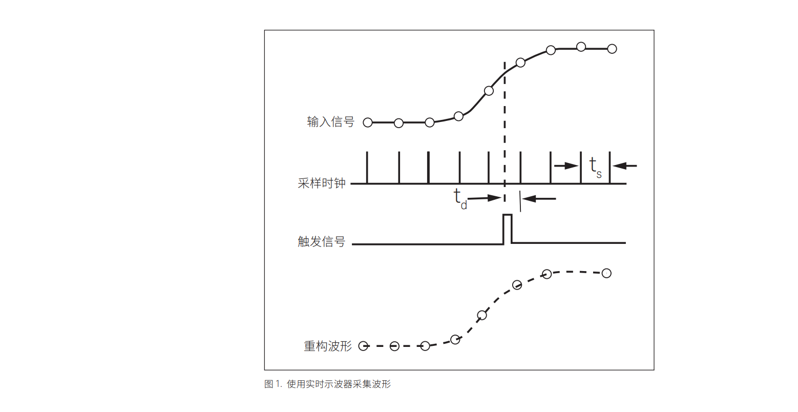 實(shí)時(shí)示波器可以根據(jù)數(shù)據(jù)本身的特征觸發(fā),通常是在輸入波形的幅度達(dá)到某個(gè)閾值 時(shí)發(fā)生觸發(fā)。這時(shí),示波器開(kāi)始將模擬波形異步轉(zhuǎn)換為數(shù)字?jǐn)?shù)據(jù)樣點(diǎn),轉(zhuǎn)換速率與 輸入波形的數(shù)據(jù)速率無(wú)關(guān)。該轉(zhuǎn)換速率稱(chēng)為采樣率,通常來(lái)自?xún)?nèi)部時(shí)鐘信號(hào)。如圖 1 所示,示波器對(duì)輸入波形的幅度進(jìn)行采樣,將采樣值保存到存儲(chǔ)器中,然后繼續(xù) 進(jìn)行下一次采樣。觸發(fā)器的主要任務(wù)是為輸入的數(shù)據(jù)提供一個(gè)水平時(shí)間參考點(diǎn)。