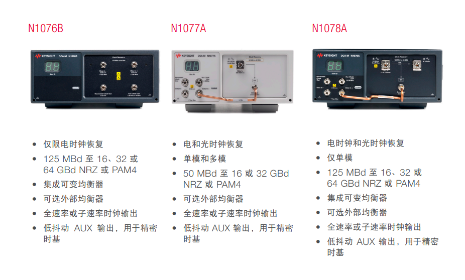 keysight N1078A 光/電時鐘恢復模塊為從 125 MBd 到 64 GBd 的 PAM4 和 NRZ 單模光信號及電信號提供符合標準的時鐘恢復功能
