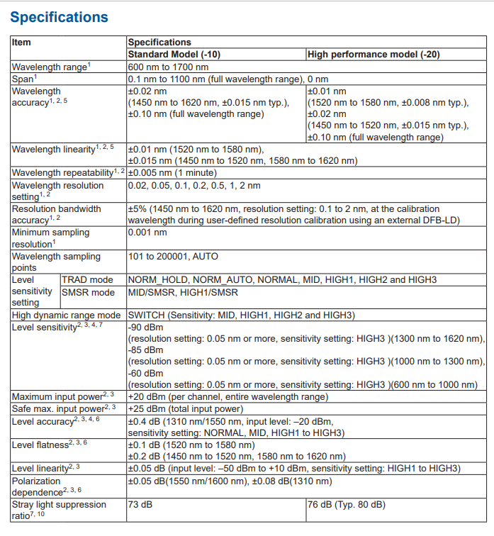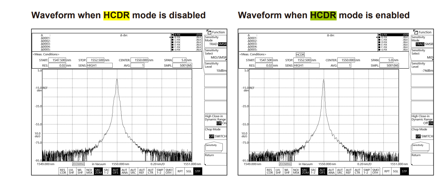 ? 高性能版(-20)有一個(gè)新的測(cè)量模式,叫做HCDR(高近峰動(dòng)態(tài)范圍)模式,可以使光譜曲線更加銳利,側(cè)模更加清晰,適用于單縱模激光的測(cè)量。