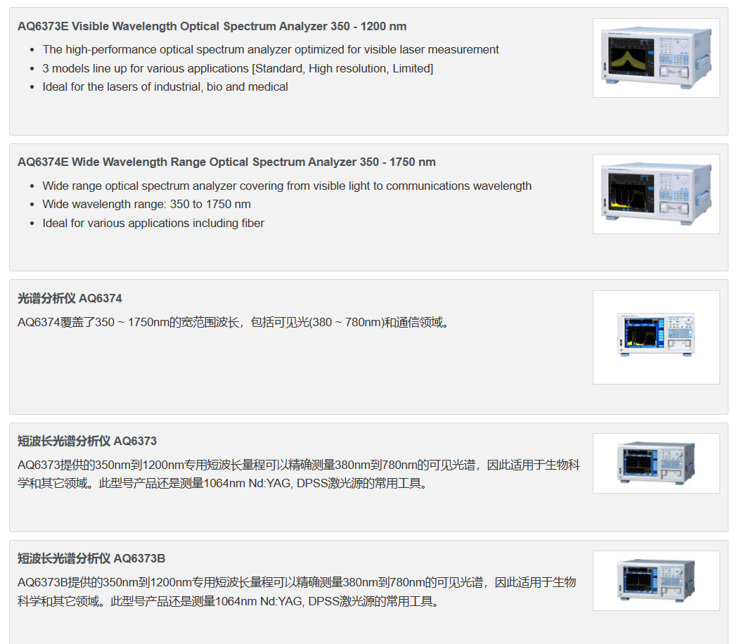 ? AQ6373E的波長范圍是350 nm - 1200 nm,而AQ6374E的波長范圍是350 nm - 1750 nm,后者覆蓋了更寬的光譜范圍。