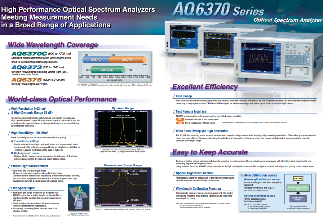 AQ6370C可以用于光有源器件、光無源器件、光傳輸設(shè)備等的測試和研發(fā),AQ6370C是一款光譜分析儀,由橫河計量儀表公司生產(chǎn),于2014年停產(chǎn):
