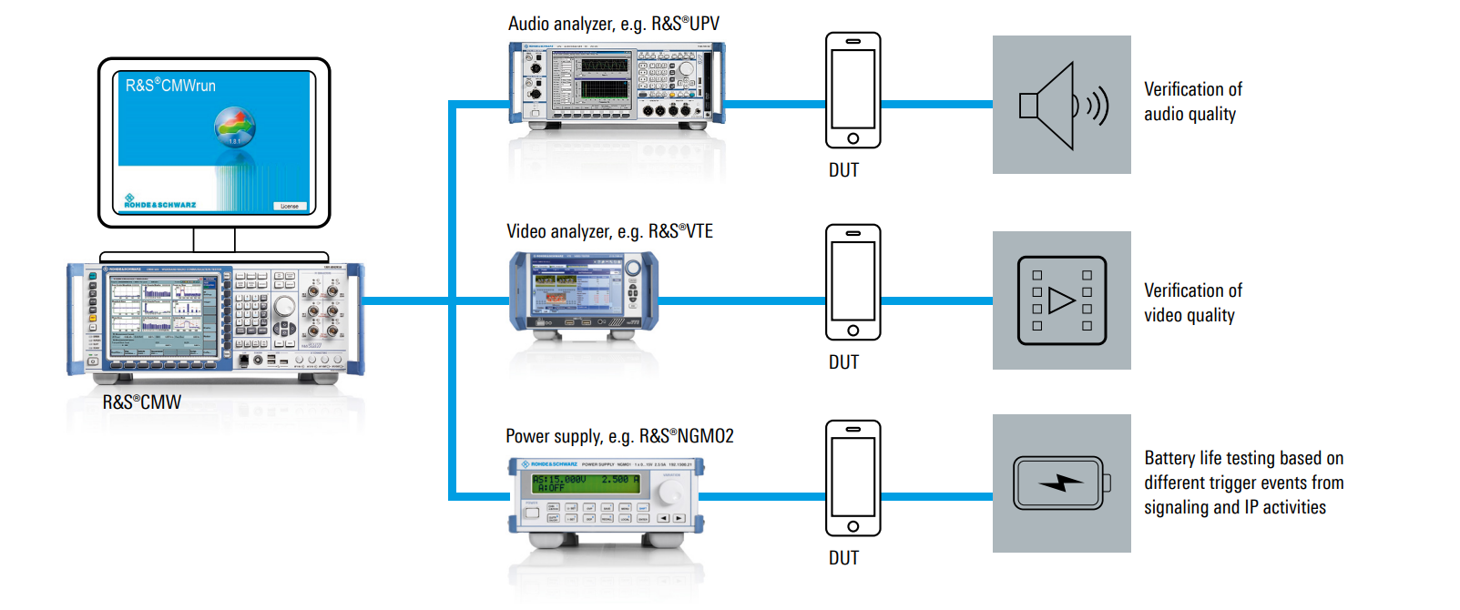 終端測試:CMW 500支持市場上幾乎所有的通信標準的終端測試,包括但不限于GSM、GPRS、EDGE、EDGE Evolution、Mobile WiMAX?、LTE FDD/TDD、TD-SCDMA、WCDMA/HSDPA、HSPA+、CDMA2000、GPS、WiFi、Bluetooth等。