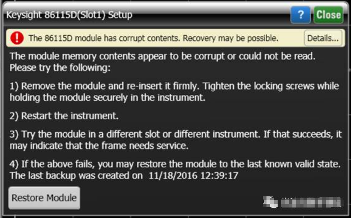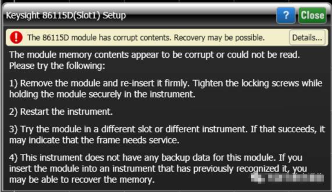 當(dāng)我們將測(cè)試模塊插入主機(jī)后,如果主機(jī)提示系統(tǒng)數(shù)據(jù)損壞“modulecorrupt contents”,但是主機(jī)能夠識(shí)別該儀器的型號(hào)和序列號(hào),主機(jī)會(huì)有如下的提示: