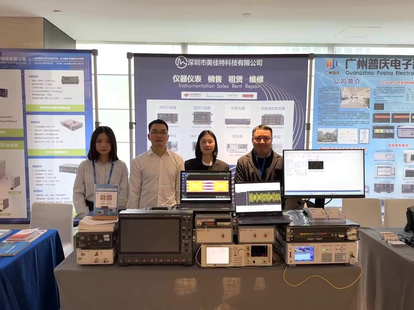 展臺上整齊排列著各種高端設備,如任意波形發(fā)生器M8195A、功率計N7745A、波長計AQ6151B、偏振綜合儀N7786B、PER分析儀N7782B、示波器N1092A 40A和光源主機8164A等。