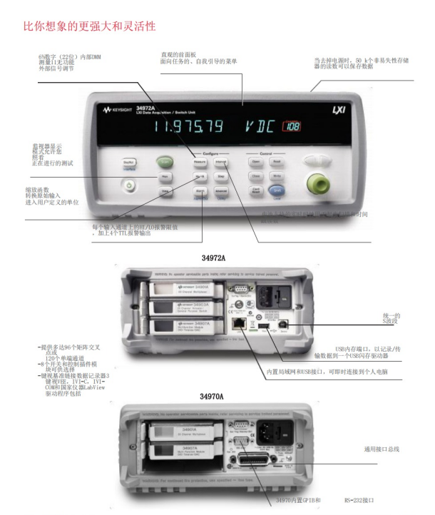 34970A提供傳統(tǒng)的GPIB和RS-232接口,34972A內(nèi)置千兆位LAN和USB 2.0,因此你可以連接到現(xiàn)代PC上,而不必再去購買其他設備。