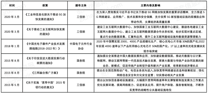 光模塊是現(xiàn)代信息光電子技術領域核心的光電子器件,應用較為廣泛,與數(shù)據(jù)中心、5G承載網的建設息息相關。因其重要性,我國政府頒布了一系列相關政策,支持光模塊產業(yè)的可持續(xù)發(fā)展。在2020年3月,工信部發(fā)布《關于推動工業(yè)互聯(lián)網加快發(fā)展的通知》,建設工業(yè)互聯(lián)網大數(shù)據(jù)中心。建立工業(yè)互聯(lián)網數(shù)據(jù)資源合作共享機制,初步實現(xiàn)對重點區(qū)域、重點行業(yè)的數(shù)據(jù)采集、匯聚和應用,提升工業(yè)互聯(lián)網基礎設施和數(shù)據(jù)資源管理能力。