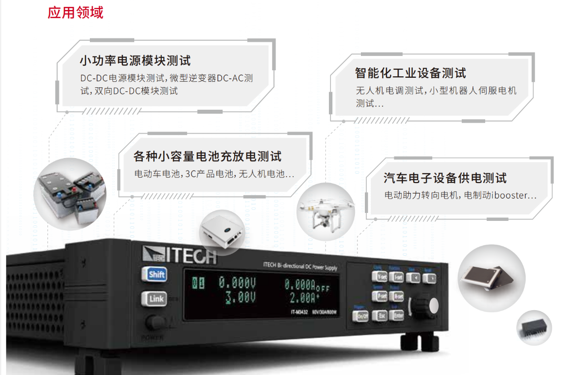 IT-M3400 雙向可編程直流電源集雙向電源和回饋式負(fù)載功能特性于一體,延續(xù)了M系列的高功率密度和模組式架構(gòu)設(shè)計(jì),可以滿足客戶的不同電流功率的測(cè)試需求。獨(dú)立的多通道設(shè)計(jì),用戶可依據(jù)待測(cè)物的測(cè)試需求數(shù)量與規(guī)格任意配置每一個(gè)通道,滿足客制化需求。同時(shí)具備高精度的輸出和量測(cè),并且針對(duì)測(cè)試做了多項(xiàng)安全設(shè)計(jì),適合用于電源模塊、智能化工業(yè)設(shè)備、汽車電子和各種小容量電池充放電測(cè)試等多個(gè)測(cè)試領(lǐng)域。